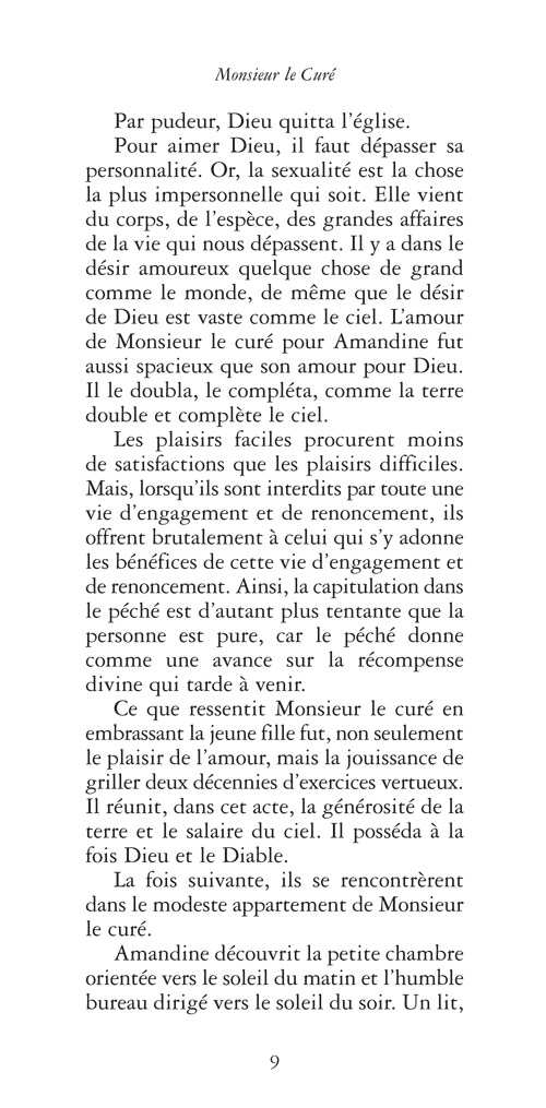 En écrivant “Monsieur le Curé”,  j’ai voulu concilier, au travers de ce personnage, les exigences de la vie spirituelle avec les désirs de la vie. Monsieur le Curé, dont l’existence est exposée en diverses tranches qui sont autant de chapitres, sait rester un bon vivant, attiré par les plaisirs de la chair ou même par les femmes, tout en préservant la rigueur de la vie religieuse. J’ai voulu, sous un mode humoristique et philosophique, faire un travail de synthèse réunissant les apparents contraires : les plaisirs et l’ascèse. Dans ce texte, interviennent des personnages emblématiques, comme le diable ou un directeur de conscience, chargés de lancer des débats théologiques qui permettent d’aboutir à des conclusions inattendues. Les commentaires de Monsieur le Curé apportent un éclairage inhabituel sur l’amour, l’Eglise et Dieu. Mais les descriptions, dans le corps même du texte, participent également à des commentaires sur la nature, l’Eglise, la Création. Il me semble que le personnage de Monsieur le Curé doit paraître sympathique au lecteur parce que réussissant une acrobatie : il est à la fois très proche d’un comportement hautement éthique et en même temps de l’être humain faible et vulnérable, sans y voir la moindre contradiction.